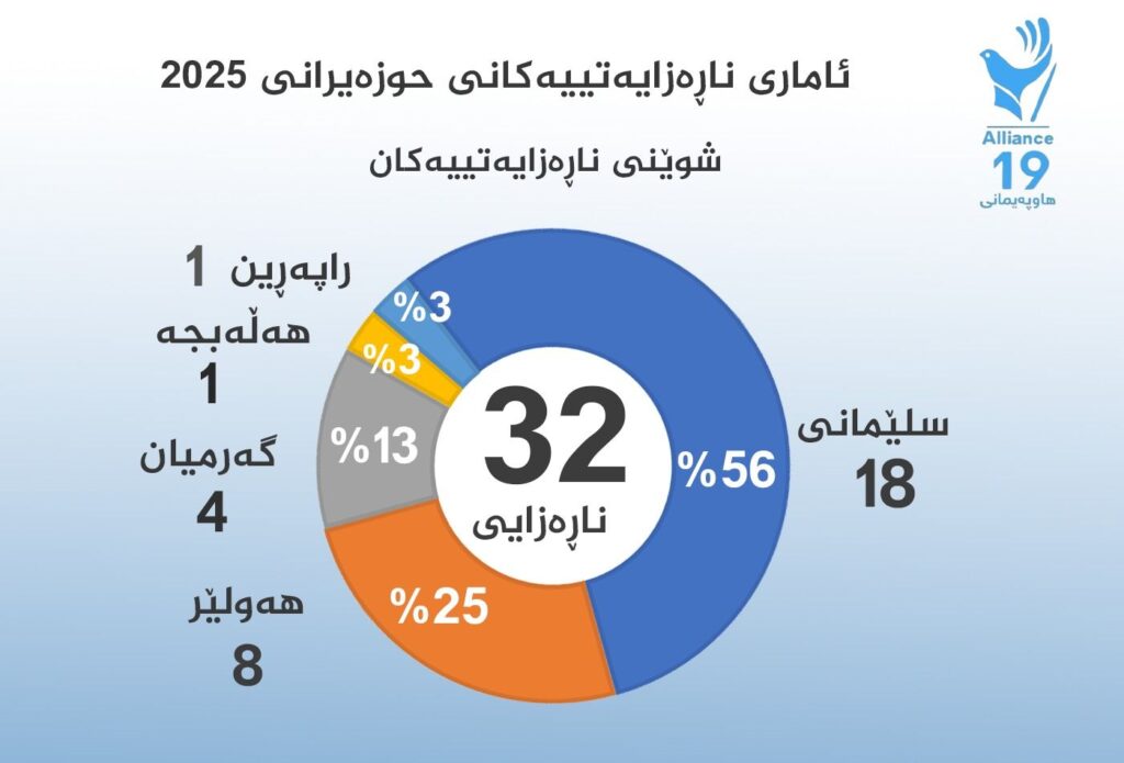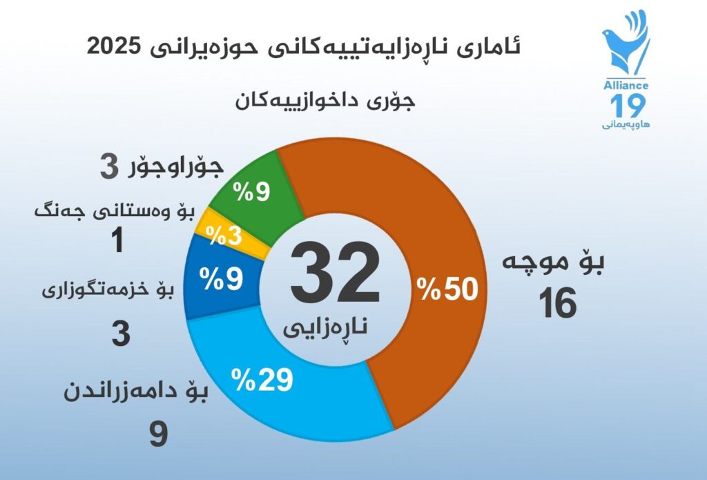 لەمانگی حوزەیرانی 2025 لە شارەكانی هەرێمی كوردستان هاوڵاتیان (32) چالاكی ناڕەزایی، خۆپیشاندان، بایكۆت، گردبوونەوەیان رێكخستووە.