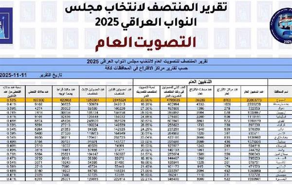 سێ شەممە، ١١ تشرینی دووەم ٢٠٢٥، کۆمسیۆنی باڵای سەربەخۆی هەڵبژاردنەکانی عێراق، ڕێژەی بەشداریکردنی دەنگدانی، بۆ هەڵبژاردنی ئەنجومەنی نوێنەرانی عێراق، لە کاتژمێر ٧:٠٠ بەیانی بۆ ١٢:٠٠ نیوەڕۆ بڵاوکردەوە، ڕێژەکە بە، شێوەیەیە: